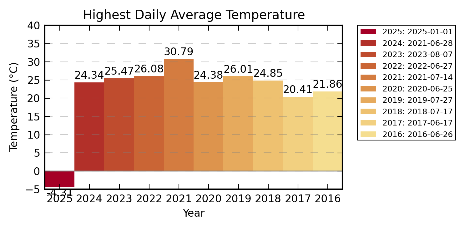 Koska ylläolevat historiakuvaajat menettävät tarkkuutta ajan myötä, alla oleviin kuvaajiin on kerätty päivittäinen mitattu korkein, matalin sekä koko vuorokauden keskiarvolämpötila.